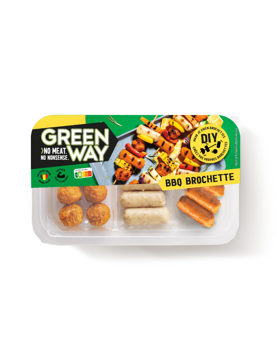 Maak je eigen plant-based brochettes met het Greenway BBQ-pakket: een mix van mini worstjes Just Like Chicken, mini merguez en gemarineerde balletjes. Extra lekker in combinatie met ui, maïs, paprika en courgette.